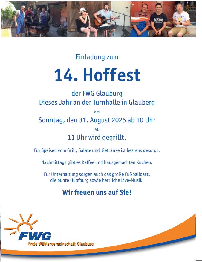 Die Freie Wählergemeinschaft Glauburg lädt zum traditionell alle zwei Jahre stattfindenden Hoffest ein.
